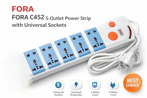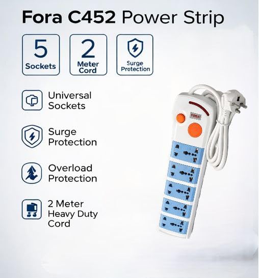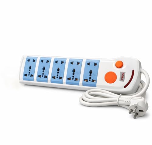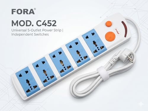Generic - مشترك كهرباء C452 من فورا، 5 مقابس عالمية مع مفتاح امان - وصلة شديدة التحمل مع حماية من الحمل الزائد - وصلة تمديد متعددة المقابس للمنزل والمكتب - ابيض/ازرق