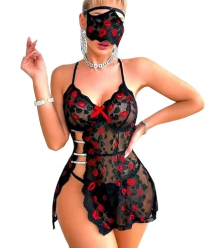 Generic - لانجيري سكسى لانجرى مثير مع ماسك اكثر اثاره بطبعة شفايف مع فتحه من الظهر بيبى دول قصير بلاى سوتس شفاف قميص نوم حريمى انيق من Four H كود 453