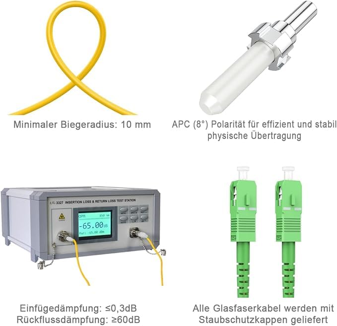 - التصميم: موصلات SC-APC خضراء اللون مع غطاء واقي، وكابل أصفر مقاوم للانحناء