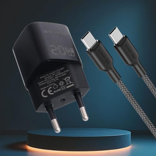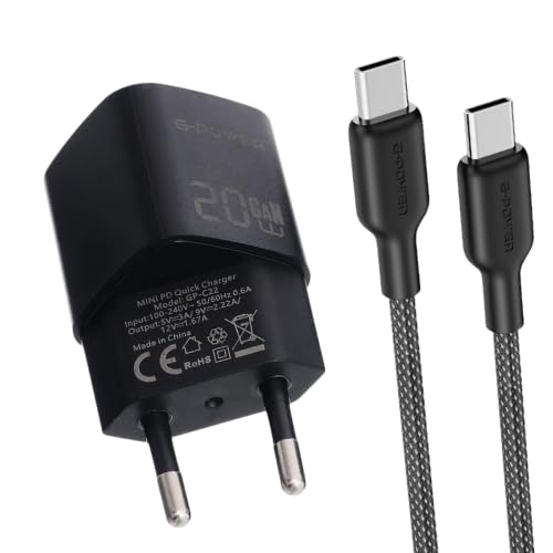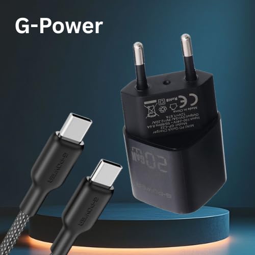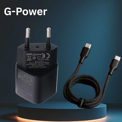 G-POWER - شاحن سريع USB نوع سي 20 واط + كيبل USB-C الى USB-C من جي باور، محول طاقة 3.0 للشحن السريع + كيبل بي دي عالي السرعة لايفون 17/16/15، سامسونج، شاومي، بيكسل، ايباد، ماك بوك - اسود