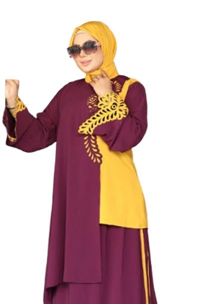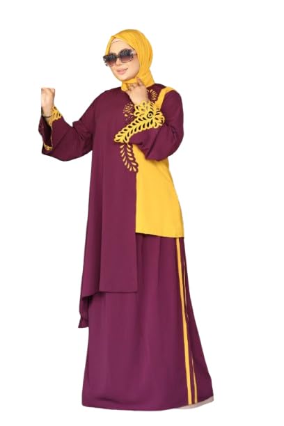 GAMAL SONS FOR ABAYA - عباية ادانة اسلامية للنساء من جمال صنز مع 5 قطع (تونيك ووشاح وحزام وتنورة وسروال) من قماش الكريب الملكي المطرز بالليزر 3025 مقاس 4XL حتى 100 كلفن - ارجواني ومسطردة
