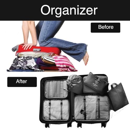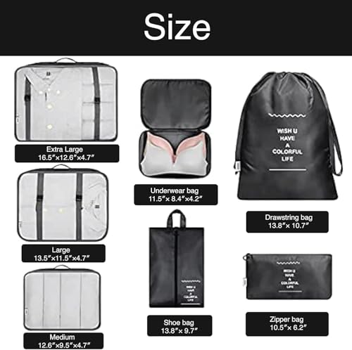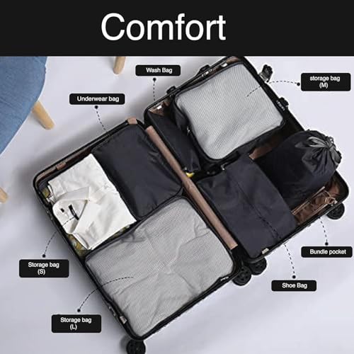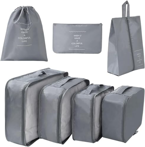 Generic - مجموعة مكعبات تعبئة للسفر من 7 قطع منظمات الامتعة لملحقات السفر منظم شنط للامتعة ومستلزمات النظافة والاحذية والملابس ومستحضرات التجميل لون رمادي نايلون