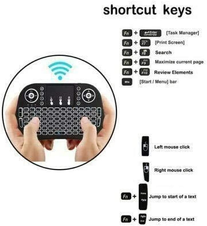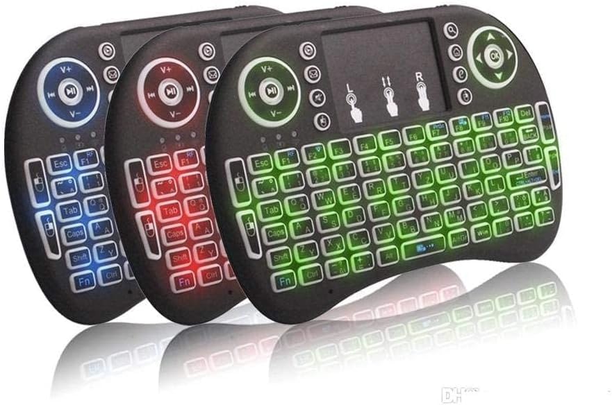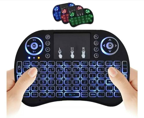 • كيبورد لاسلكي صغير بلوحة لمس، وإضاءة خلفية زرقاء، تحكم في الوسائط المتعددة للتلفزيون الذكي والكمبيوتر.