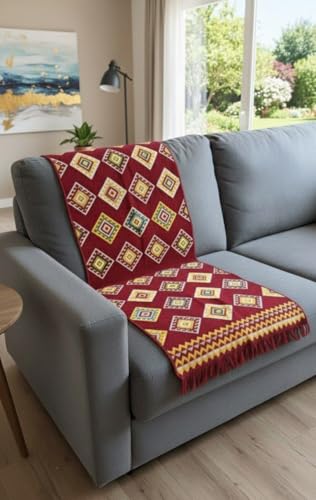 • تصميم متعدد الاستخدامات: يتميز مفرش شانيلا ذو الوجهين بقاعدة حمراء نابضة بالحياة مع أنماط ماسية هندسية ملونة، مثالي للاستخدام كمفرش طاولة أو ملفوف فوق الأرائك والأرائك الزاوية