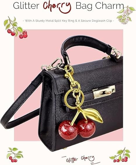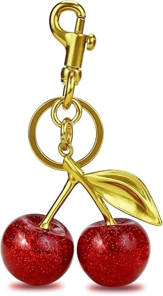 Generic - تعليقة شنطة شيري لامعة مع حلقة معدنية ذهبية، سلسلة مفاتيح بلون احمر كرزي مزدوج، 7 سم