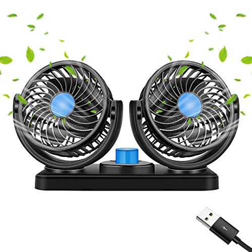 Gobesty - مروحة سيارة محمولة مزدوجة الرأس بمنفذ USB جهد 5 فولت مكيف هواء دوارة 360 درجة ضوضاء منخفضة بسرعتين للسيارة والمنزل والمكتب - أسود، 5.0 واط