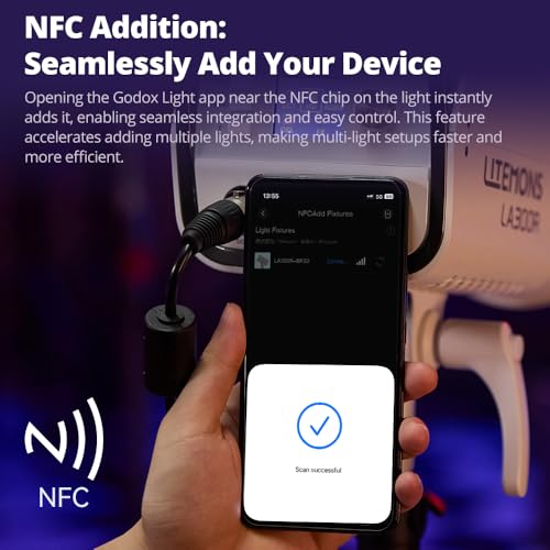 - تكامل سلس لأجهزة الاتصال قريب المدى NFC: أضف LA300R بسرعة إلى ضبط الإعدادات الخاص بك ببساطة عن طريق فتح تطبيق إضاءة جودوكس بالقرب من شريحة NFC الخاصة به. تبسط هذه الميزة عملية دمج مصابيح متعددة، مما يسرع ضبط الإعدادات ويعزز الكفاءة.