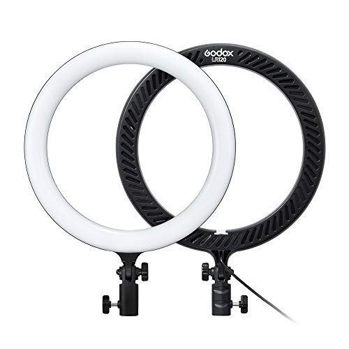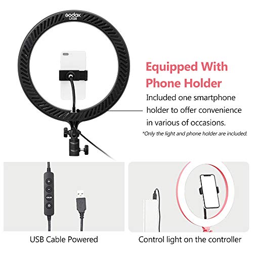 GODOX - إضاءة حلقة LR120 ليد بقطر 30 سم، إضاءة استوديو بدرجة سطوع قابلة للتعديل بضبط بين 3000 و6000 كلفن بلونين قابلين للتعديل بمنفذ USB مع حامل موبايل للبث المباشر وصور السيلفي والمكياج من جودوكس، أسود