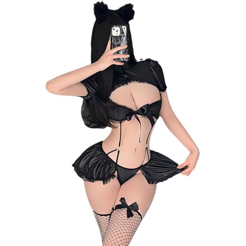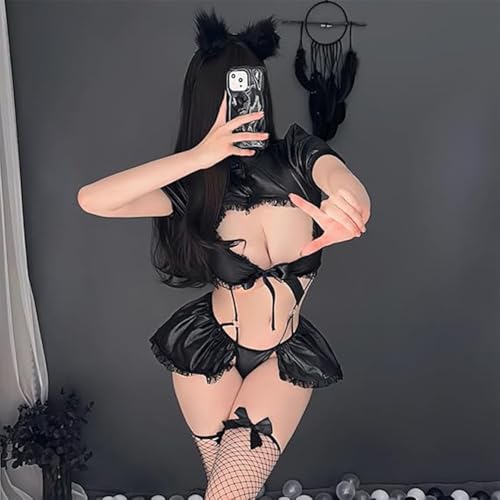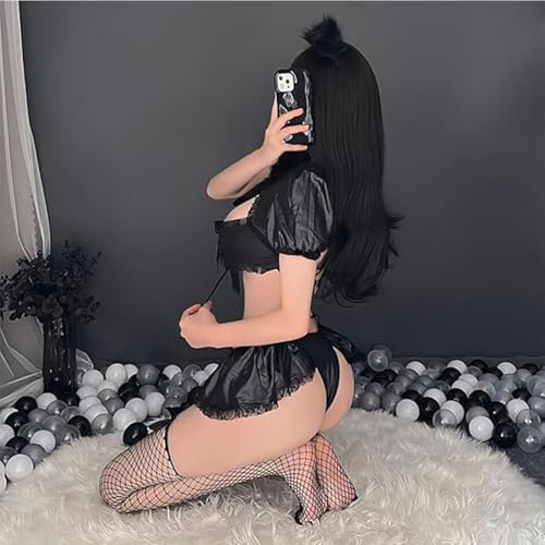 GQ - طقم أزياء تنكرية بشك القطة من جي كيو، مكون من بلوزة قصيرة وأكمام نفخ وزينة من الدانتيل، تنورة، أذني القطة، جوارب شبكية