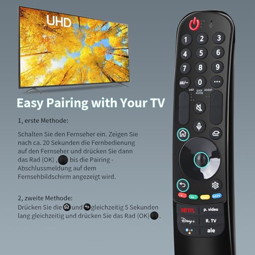 - سهولة الاقتران: يجب إقران جهاز التحكم عن بعد البديل من ال جي ماجيك MR22GN مع التلفزيون للعمل. ① قم بتوصيل البطاريات بجهاز التحكم عن بعد LG MR22GN وقم بتشغيل التلفزيون. ②اضغط على العجلة (موافق) على جهاز التحكم عن بعد. إذا لم يتمكن التلفزيون من تسجيل جهاز التحكم عن بعد السحري، فحاول مرة أخرى بعد إيقاف تشغيل التلفزيون وتشغيله مرة أخرى.