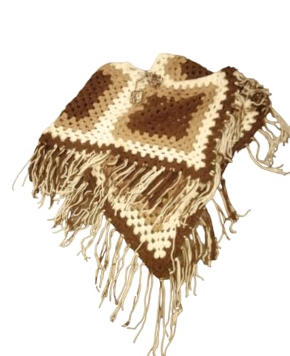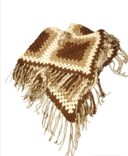 Generic - شال صوف كروشيه يدوي، نمط مخطط، بني وبيج، مثلث الشكل مع شراشيب