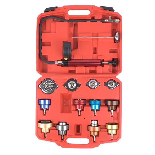 • ❄ قم بإزالة غطاء الرادياتير الأصلي، واختر غطاء الرادياتير المتاحة من مجموعة الاختبار وقم بتركيبه على فتحة المبرد. افرك المضخة اليدوية حتى الضغط حتى 10-15 رطل لكل بوصة مربعة (تجنب حتى 35 رطل في الإنش المربع). تحقق من قياس القراءة، إذا سقطت القراءة تلقائيًا، فهذا يعني أنه يوجد تسرب قد يحدث في المبرد. يرجى فحص نظام الرادياتير وإصلاحه إذا لزم الأمر. عادة، يستغرق الأمر حوالي 10 دقائق لاختبار التسريب، سهل جدا وسريع التشغيل.