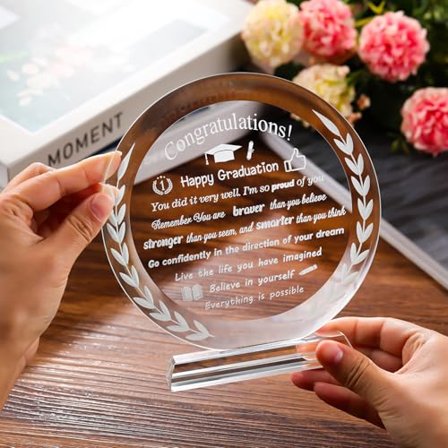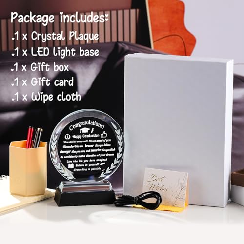 - 【كريستال وحرف يدوية】لوحة التخرج الكريستالية هذه مصنوعة من زجاج رائع ولامع وبدون فقاعات، يتم اختيار كل تذكارات وصقلها بعناية من قبل حرفيين لكسر الأضواء بشكل أفضل وزيادة الشعور بالروعة، جميع الأنماط والكلمات محفورة بالليزر داخل الزجاج. متينة بما يكفي لتدوم مدى الحياة. ستفاجئه وتبقى معه لفترة طويلة