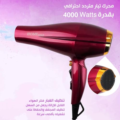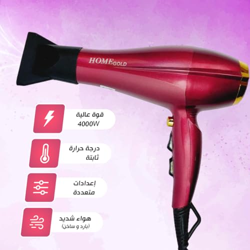 Home Gold - مجفف شعر 4000 وات بأداء تجفيف فائق وإعدادات متعددة وعناية أيونية وحماية من الحرارة الزائدة وتصميم أنيق، HG-803