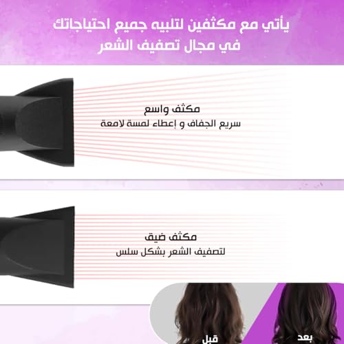 • العناية بالشعر بتقنية الأيونات: يحمي ويغذي شعرك عن طريق تقليل التجعد وتعزيز اللمعان للحصول على مظهر أنيق ولامع.