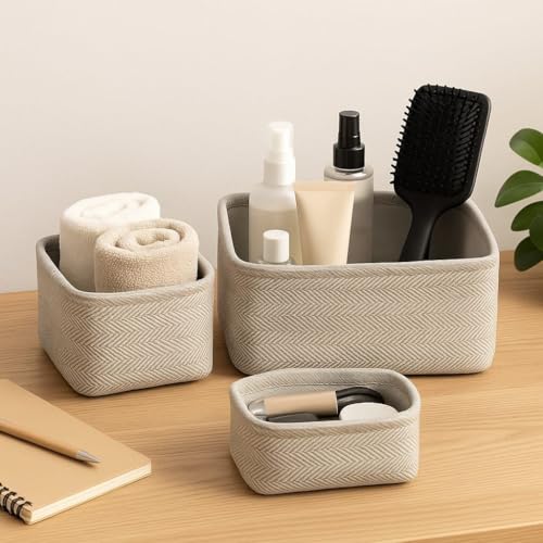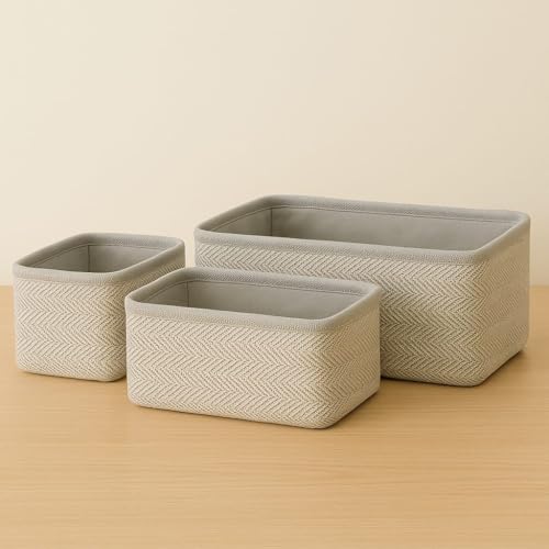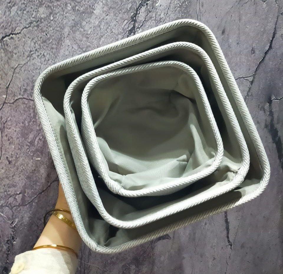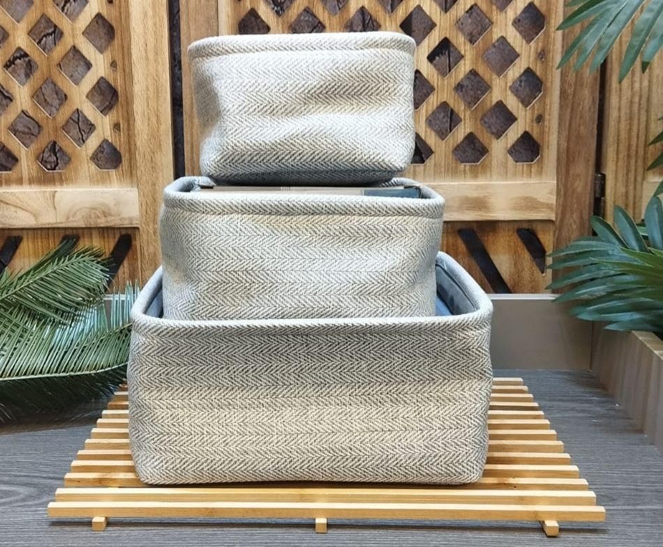 - ٥) أحجام متدرجة: ثلاثة أحجام مختلفة للتنظيم الأمثل، مصنوعة من قماش كتان عالي الجودة بلون رمادي فاتح