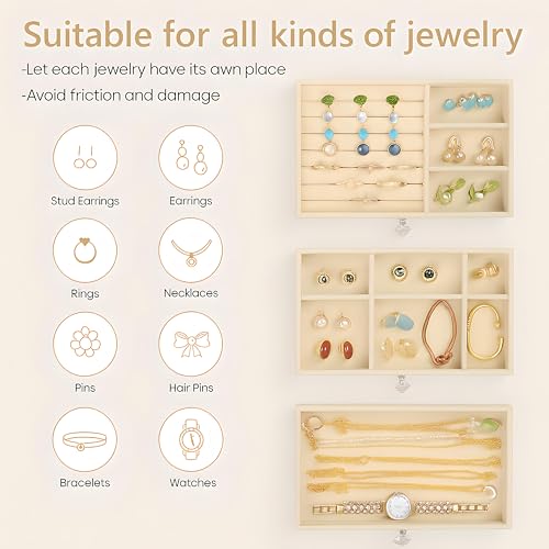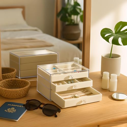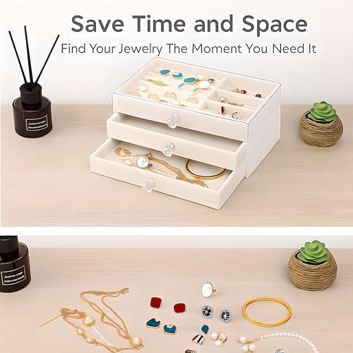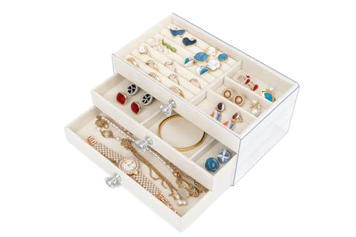 HOMICKER - صندوق مجوهرات اكريليك مع 3 ادراج، أبيض