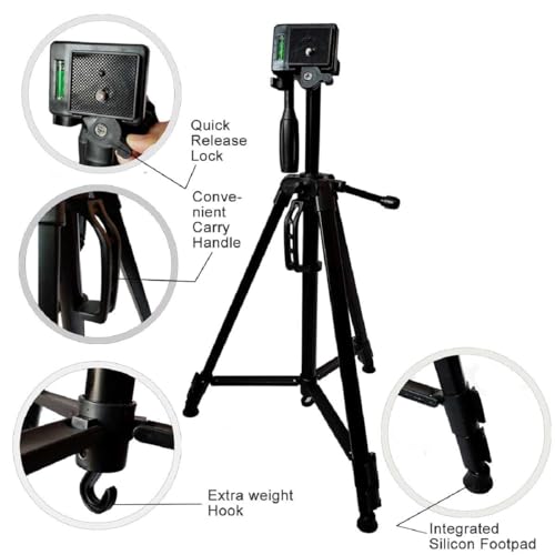 - حامل ثلاثي محمول وخفيف الوزن: مصنوع من خليط معدني من الألومنيوم خفيف الوزن، ارتفاع مطوي 52 سم، وتصميم بمقبض محمول باليد، سهل الحمل.