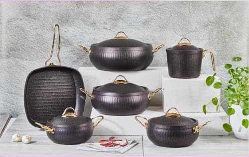 Ideal home - طقم حلل جرانيت تركى بومبية بيد مدهبة من ايديال هوم، طقم 11 قطعة (أسود)