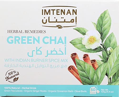 - شاي أعشاب أخضر (طبيعي 100%) من إمتنان. مشروب عشبي ممتع يحتوي على الشاي الأخضر مع الزنجبيل ومزيج التوابل الهندي.
