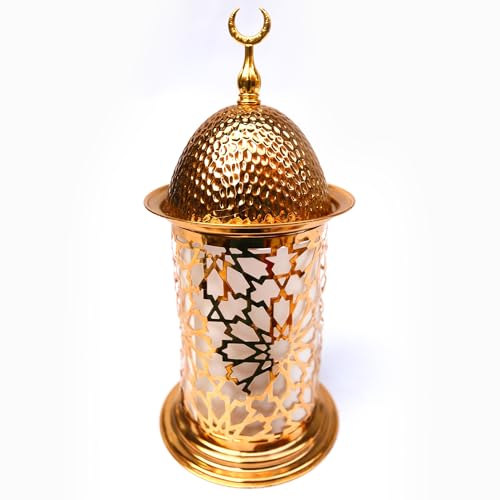 - فانوس طاولة مزخرف أنيق بلمسة نهائية معدنية ذهبية لامعة وأنماط معقدة على الطراز الإسلامي على الألواح الزجاجية.