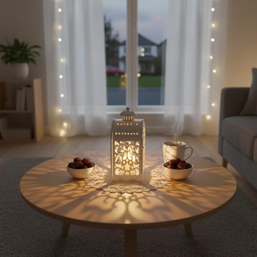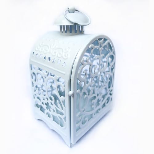 - فانوس معدني أبيض مزخرف بأنماط مجوفة معقدة وباب مقوس