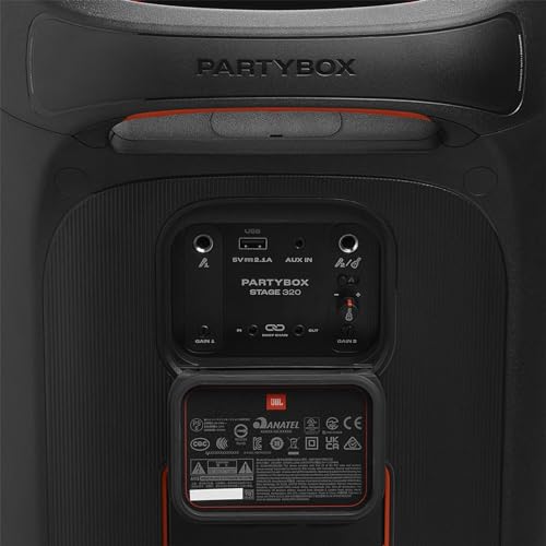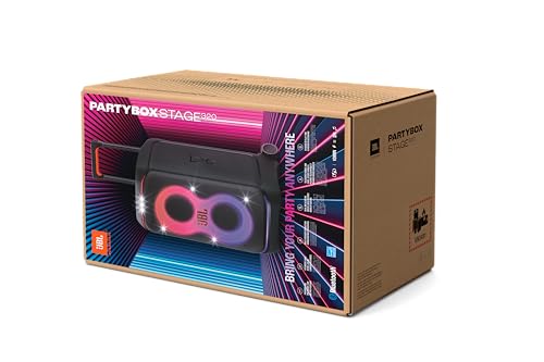 JBL - مكبر صوت لاسلكي محمول بارتي بوكس ستيج 320 من جيه بي ال، صوت احترافي ومؤثرات ضوئية ومقاومة للماء بتصنيف IPX4 وبطارية 18 ساعة ومدخل لكابل الميكروفون والجيتار واتصال بلوتوث، لون أسود