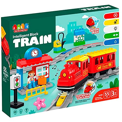 JDLT - مكعبات تركيب قطار ذكي من جيه دي ال تي، مع مكعب مستشعر، 55 قطعة، قطار بضوء وصوت، بلاستيك