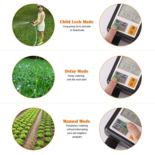 - ③ متعددة الوظائف: بالإضافة إلى برنامج الري التلقائي، يحتوي نظام الري على ثلاثة أوضاع أخرى متاحة. الوضع اليدوي: يمكن إجراء الري في أي وقت ولا يوجد تعارض مع برنامج الري الذي تم إعداده. وضع المطر: من أجل حماية النباتات وتوفير الماء، أثناء المطر، سيتأخر حتى برنامج بدء الري التالي؛ وضع الطفل: يمنع الأطفال اللطفاء من استخدام هذا المنتج.