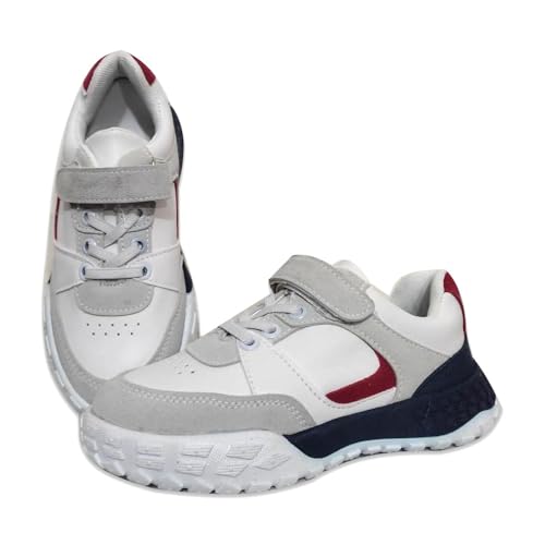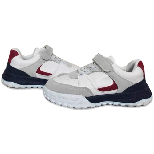 Generic - حذاء رياضي للاطفال، ابيض ورمادي مع لمسات كحلي وحمر، شريط لاصق فيلكرو للاغلاق