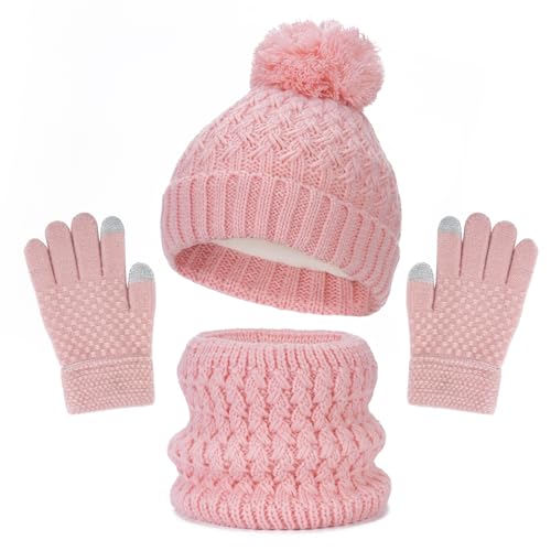 KEEPFLY - طقم قبعات صغيرة شتوية للاطفال وقفازات ووشاح للبنات والاولاد، قبعات للاطفال الصغار مع كرات بوم محبوكة سميكة ودافئة