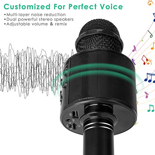 KIDWILL - ميكروفون كاريوكي لاسلكي يعمل بالبلوتوث للاطفال من كيدويل 5 في 1 محمول باليد ومسجل مع راديو اف ام ريمكس قابل للتعديل والبنات والاولاد والمراهقين واعياد الميلاد اسود أحادي الاتجاه