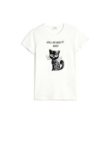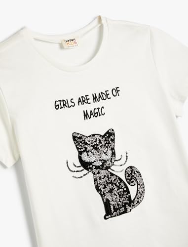 KOTON - KOTON Girls Short Sleeve Crew Neck Cat Sequined Detail Tshirt