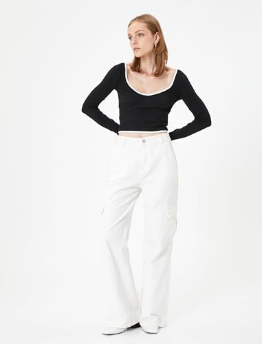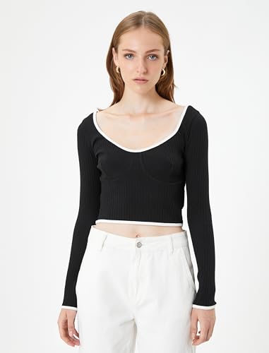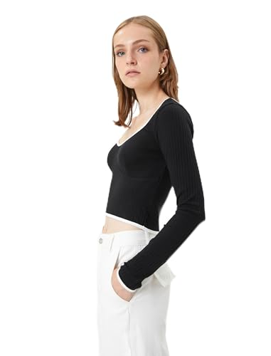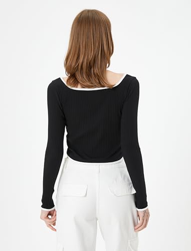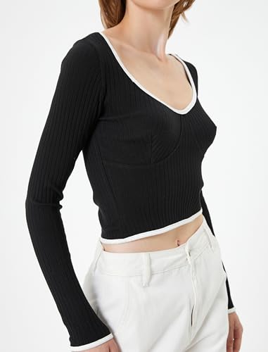KOTON - KOTON womens Ribbed Binding Detail U Neck Long Sleeve Crop Tshirt