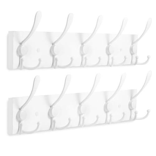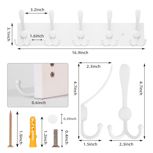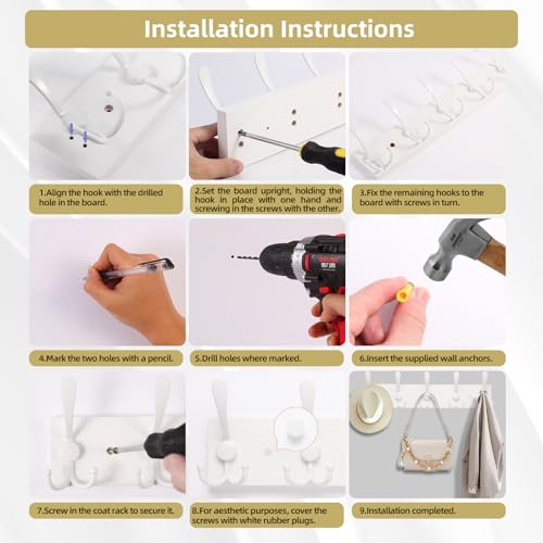 - [رف معطف قوي]: يحتوي الرف على خطافات معدنية قوية وقاعدة من خشب الصنوبر الصلب، يمكن لكل خطاف حمل ما يصل إلى 30 باوند من الوزن. الخطافات البيضاء على لوحة القاعدة البيضاء تبدو نظيفة وجميلة