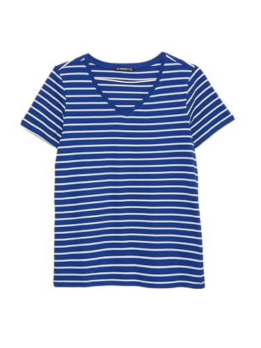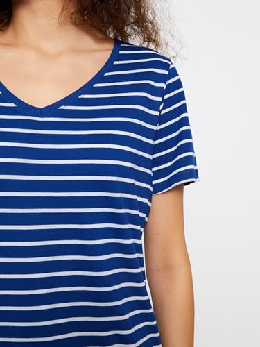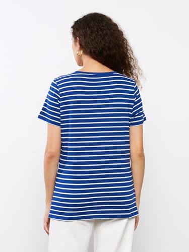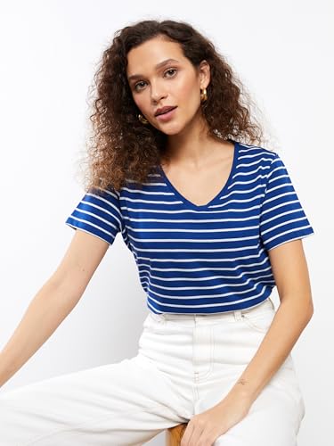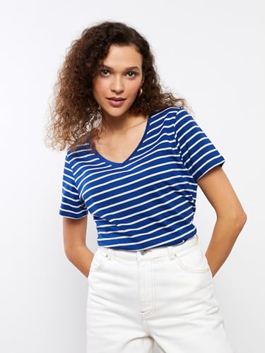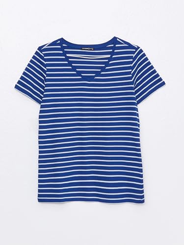 LC WAIKIKI - LC واكيكي تيشرت مخطط باكمام قصيرة ورقبة شكل V للنساء S33840Z8-Lgs-1، مقاس XL، لون كحلي