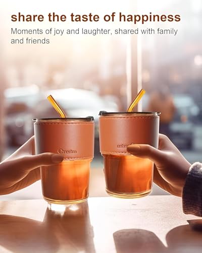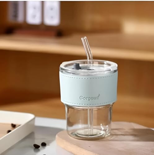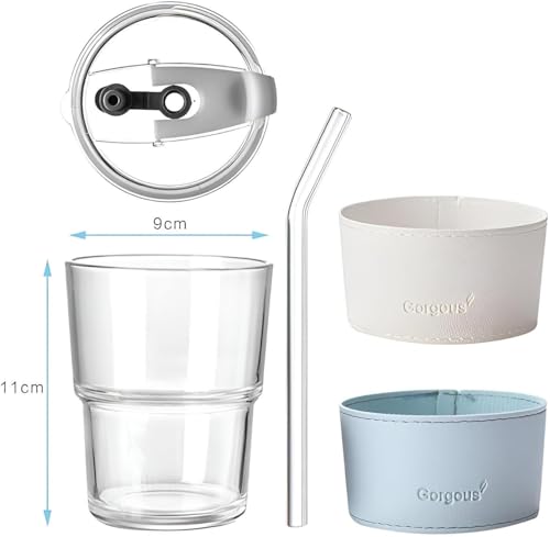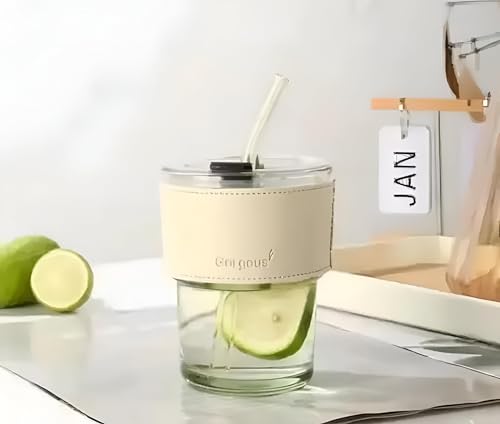 Generic - زجاجة شرب مانعة للتسرب - كوب زجاجي قابل لاعادة الاستخدام بسعة 400 مل مع غلاف جلدي وقشة سيليكون وغطاء آمن، مثالي للقهوة والشاي او الحليب اثناء التنقل باللون الابيض.