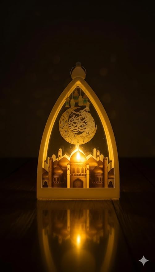 Generic - فانوس زينة رمضاني بوجده اضائه LED، مزين بهلال ورمضان كريم 25 سم ومساجد هدية منزلية، بلون ابيض خمات عاليه الجوده