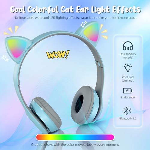 LIFEJXWEN - سماعة رأس بلوتوث لاسلكية قابلة للطي للأطفال بتصميم قطة مع إضاءة ليد وصوت محدود حتى 85 ديسيبل تدعم بطاقة SD وراديو اف ام والرد على المكالمات من لايف جيه اكس وي (لون أزرق وأبيض)