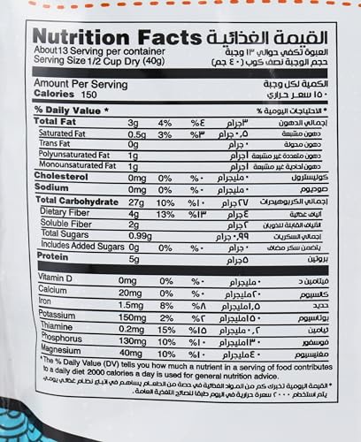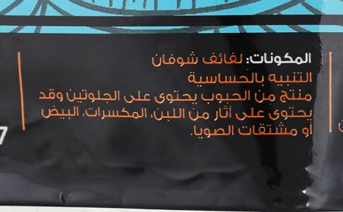 - المكونات: منتج من الحبوب يحتوي على الجلوتين وقد يحتوي على آثار من اللبن، المكسرات، البيض أو مشتقات الصويا
