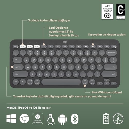 Logitech - كيبورد K380s بيبل بمفتاحين بلوتوث تركي كيو مع وظيفة أجهزة متعددة من لوجيتيك - أسود