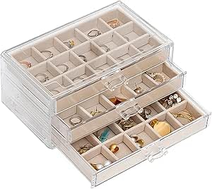 - 【3 أدراج】أبعاد صندوق التخزين الأكريليك: 9.4 انش × 5.8 انش × 4.3 انش. يحتوي كل درج على 15 مساحة تخزين صغيرة بنفس الحجم. ويمكنك تكديس صندوقين للمجوهرات أو أكثر.