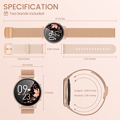 - تصميم يمكنك الاعتماد عليه - تتميز الساعة الذكية للنساء بتصميم بدون حواف وإطار من خليط الألومنيوم باللون الذهبي الوردي، كما قمنا بإعداد سوار من الستانلس ستيل بلون ذهبي وردي لتعزيز ملابسك الأكثر أناقة. وشاشة LCD HD عالية الدقة مقاس 1.28 بوصة مع تقنية اي بي اس معيار مقاومة المياه لتعزيز اللون والوضوح. بوزن خفيف 0.1 باوند، وسمك 0.25 بوصة، وحزام سيليكون لطيف على البشرة، يسمح لك بالاستمتاع بخفة الوقت.