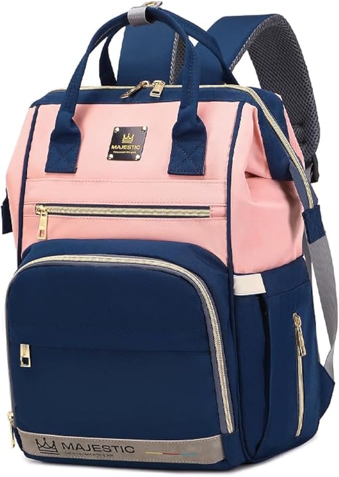 MAJESTIC - حقيبة حفاضات مومياء عصرية 134 - سعة كبيرة، حقيبة ظهر مقاومة للماء ومتعددة الوظائف للعناية بالطفل (ازرق-بينك)