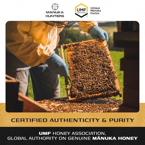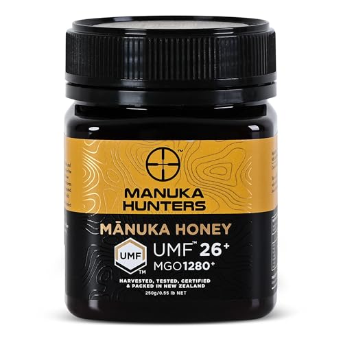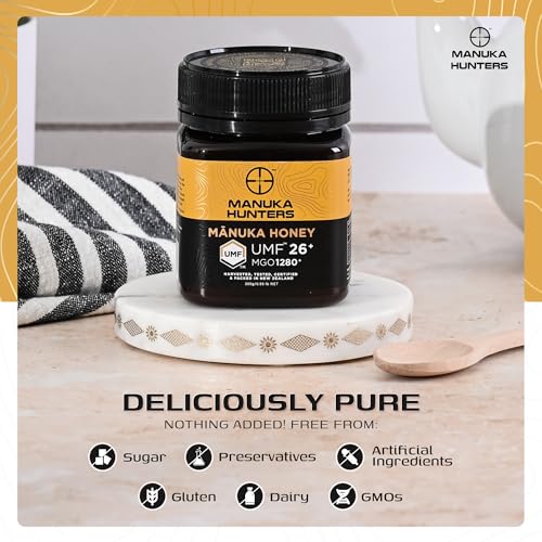 Manuka Hunters - عسل مانوكا نيوزيلندي من مانوكا هانترز، معتمد من يو ام اف 26+/ ام جي او 1280+، محلي طبيعي نقي 100% خال من الجلوتين ومنتجات الألبان للشاي والقهوة والعصائر السموذي والخبز من مصدر مستدام (250 جرام)