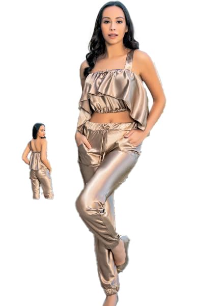 Marti Homewear & Lingerie - طقم لانجري من مارتي هوم وير اند لانجري 4252 انيق من الساتان مكون من قطعتين مع بلوزة مكشكشة وسروال رياضي للنساء