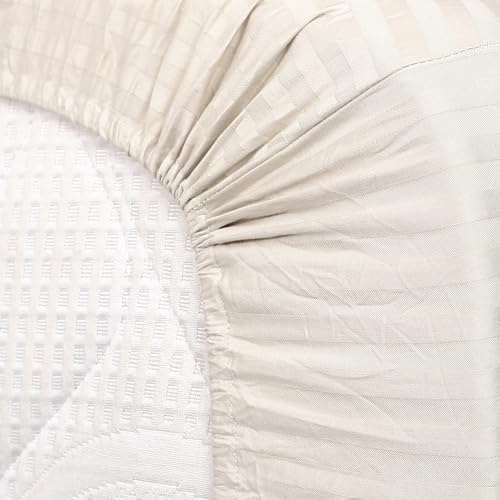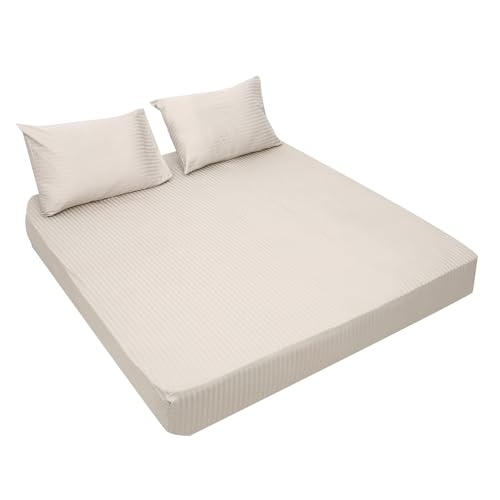 • طقم الملاية الساتان المصمم بأستك ونمط خطوط بعرض 1 سم يضمن ملاءمة محكمة وثابتة على مرتبتك