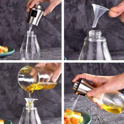 Generic - بخاخة مضادة للتسرب لزيت الزيتون مع قمع صغير قابل لاعادة الملء من الستانلس ستيل ميوبيلز للخبز والشواء والتحميص والقلي 200 مل واحدة وقمع واحد زجاج