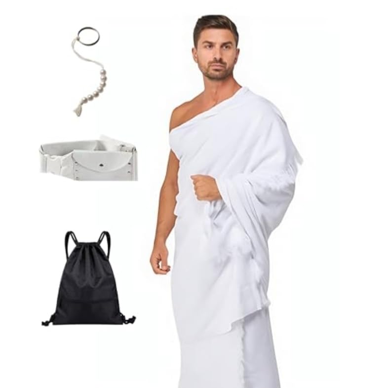 Generic - طقم إحرام للرجال من مون، مصنوع من القطن، باللون الأبيض، مقاس موحد، بتصميم إسلامي تقليدي، يشمل حزام وحقيبة ظهر ومسبحة