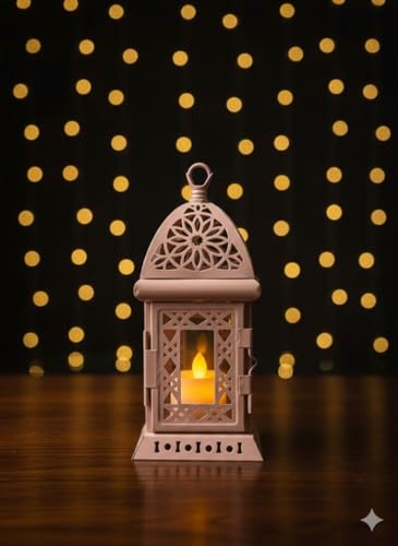 - تصميم مغربي أنيق: فانوس زخرفي معدني باللون الوردي يتميز بنقوش هندسية إسلامية معقدة على شكل زهرة في الجزء العلوي وأنماط شبكية جميلة على الجوانب
